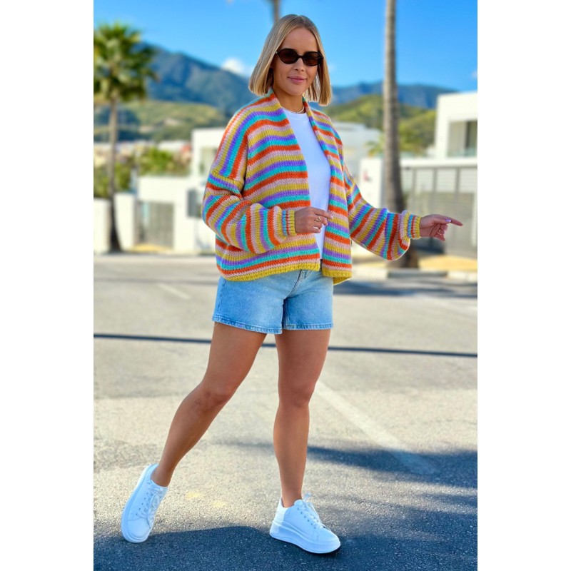 Short, light oversized cardigan in stripes - lemon/powder rose