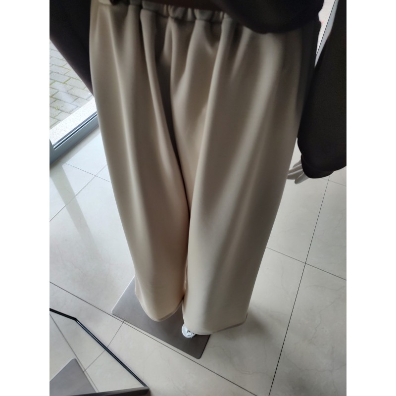 - Viscose fabric, also known as butter-like fabric Wide, straight legs Wide elastic waistband and decorative belt Decorative pleats at the front Elastic gathers at the back Two slip pockets