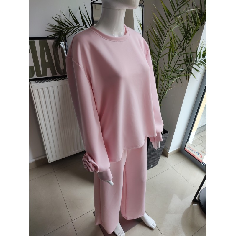- Viscose fabric, so-called butter-print Loose-fit sweatshirt Round neckline Rib-knit cuffs, straight hem Feather-print on the sleeves Loose-fit trousers with wide legs Elastic waistband and drawstring Two slip pockets