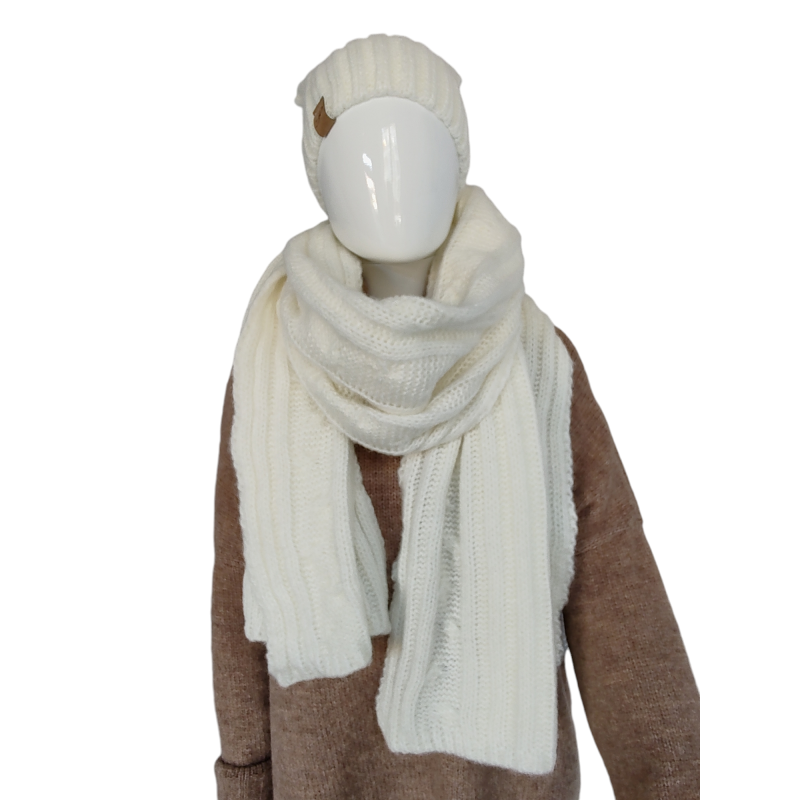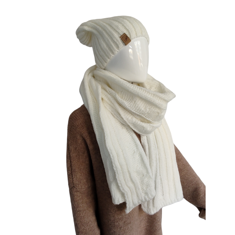 Ciepły komplet składający się z czapki i długiego szalika. Wykonany z wysokiej jakości materiałów.