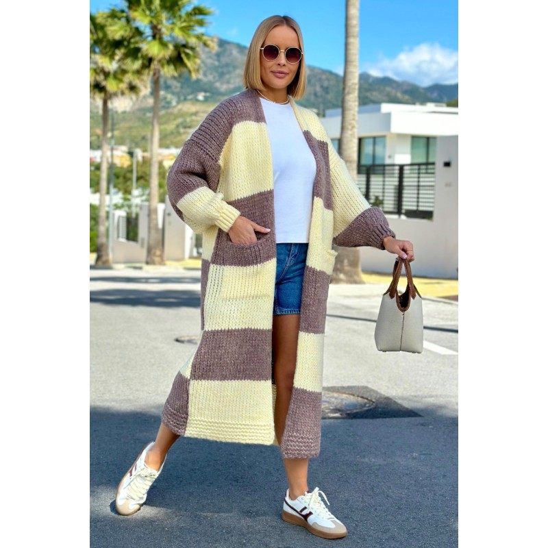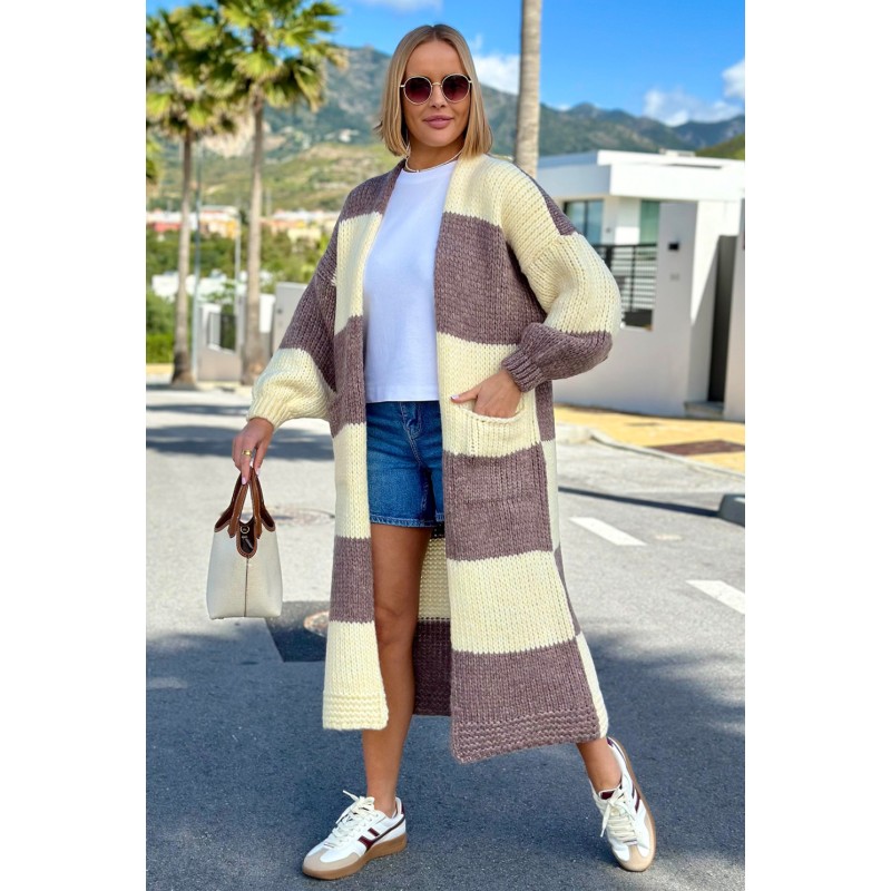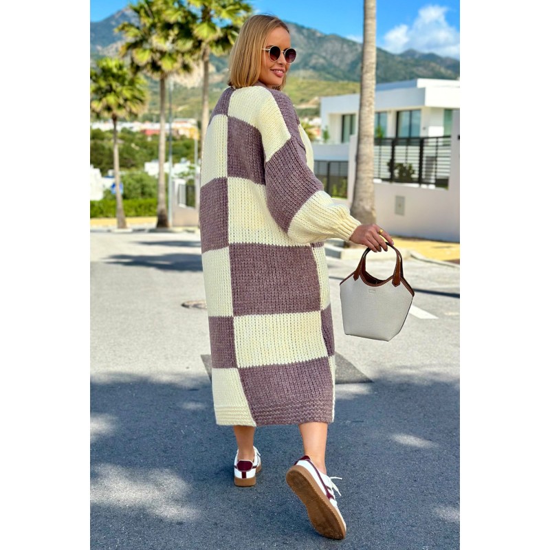 Langer Karo-Cardigan mit Taschen – Kakao  Langer Karo-Cardigan mit Taschen – Kakao