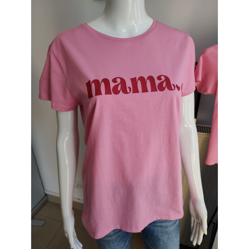 - das Damen-T-Shirt mit einer roten Aufschrift "mama“ und einem zarten Herz, schlichte Rückseite